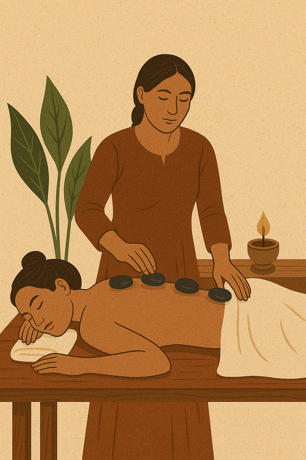 During the session, warm stones are placed on key energy points while flowing massage techniques encourage deep relaxation. The gentle heat penetrates the muscles, improving circulation and releasing layers of stress that the body holds.