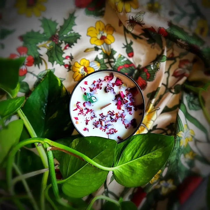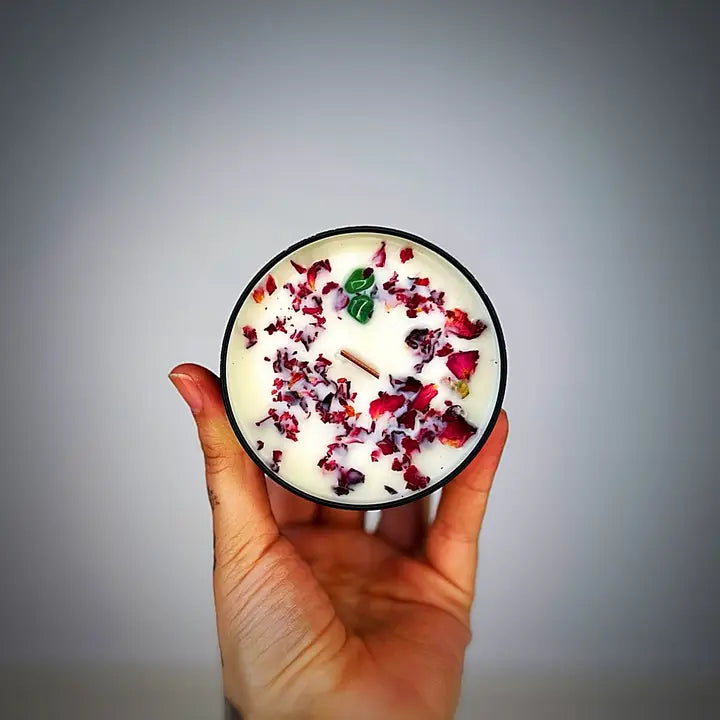 Infused with crystals such as rose quartz and aventurine, it supports the heart chakra, helping you release old wounds, open to love, and reconnect with your worth. Light it during meditation, rituals, or daily self-care to create a space of softness, warmth, and empowerment.